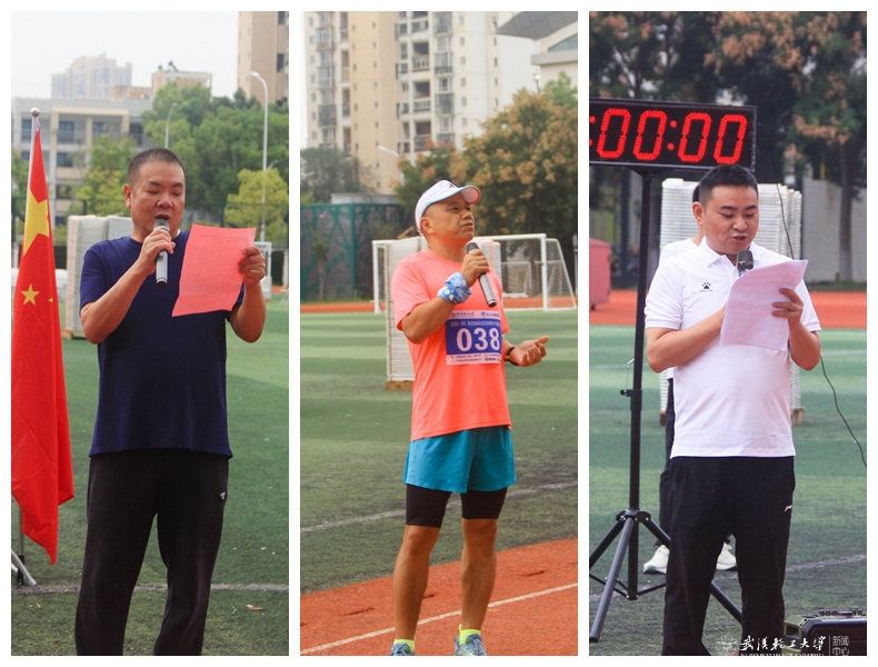 从左到右依次为:武汉校友会执行会长刘德忠、轻工大武汉跑团团长谢尚军致辞,武汉校友会常务副会长王志凌主持活动