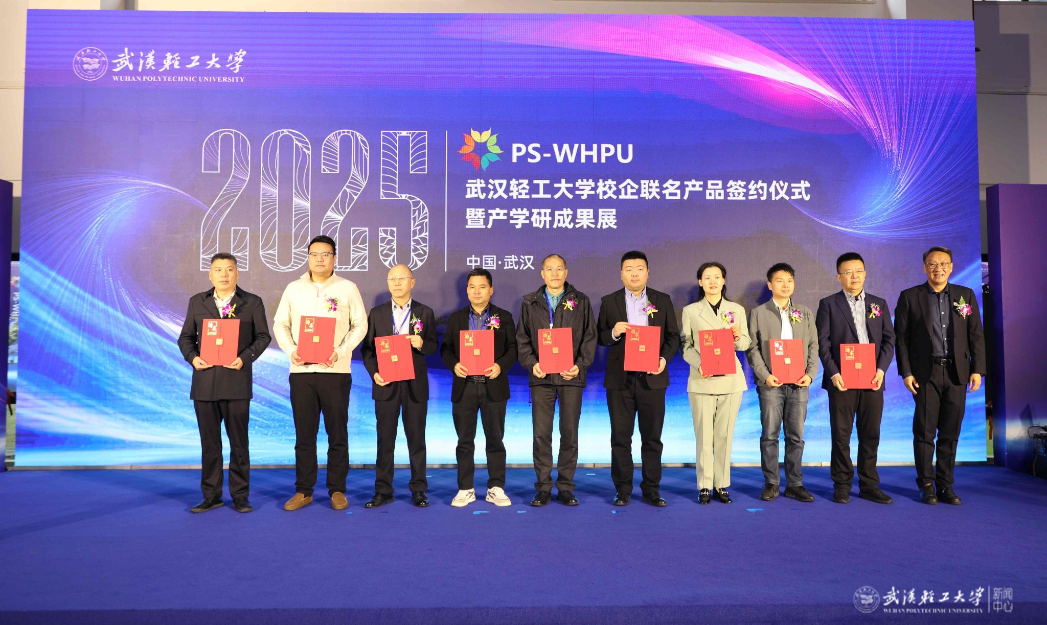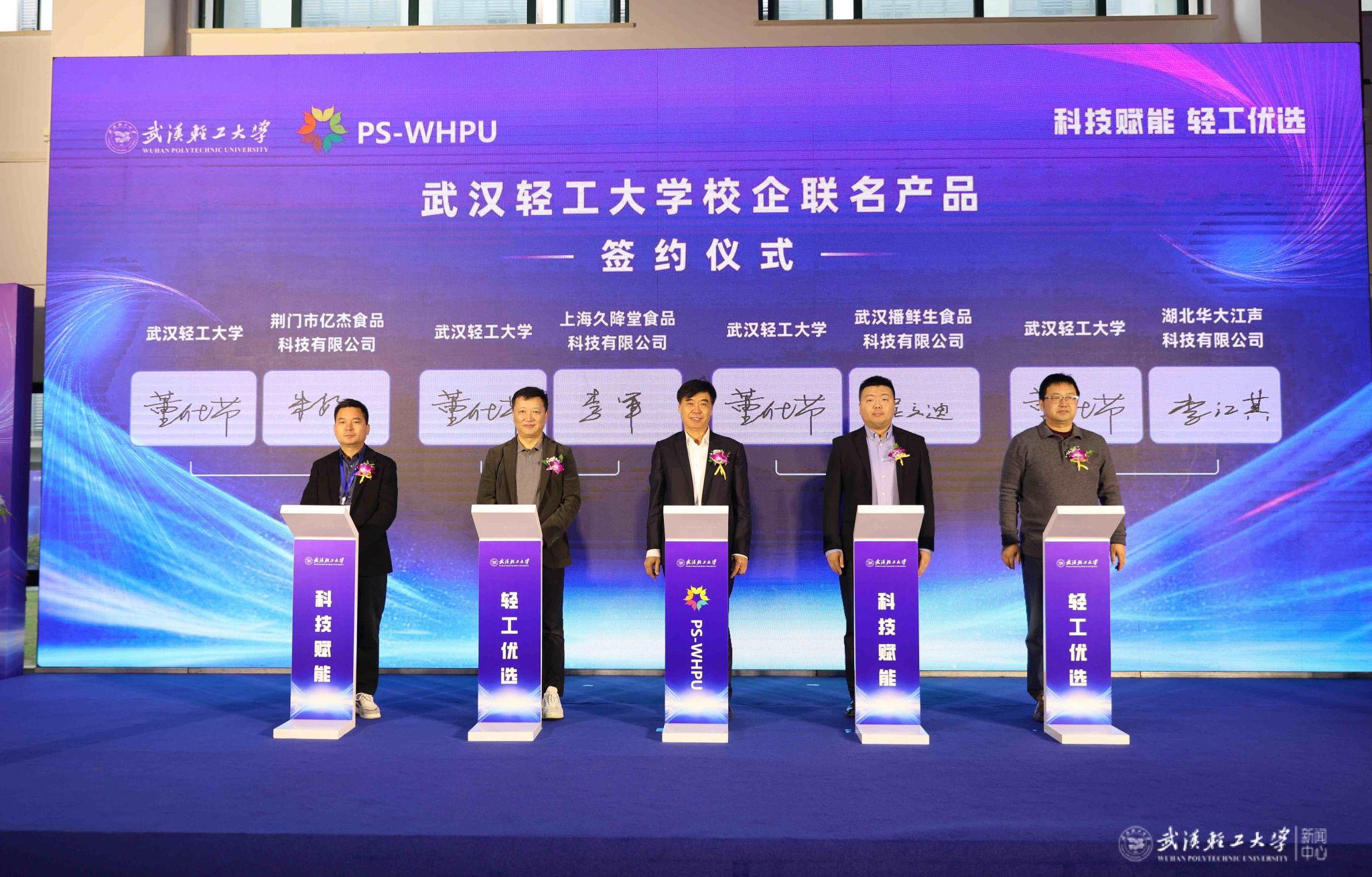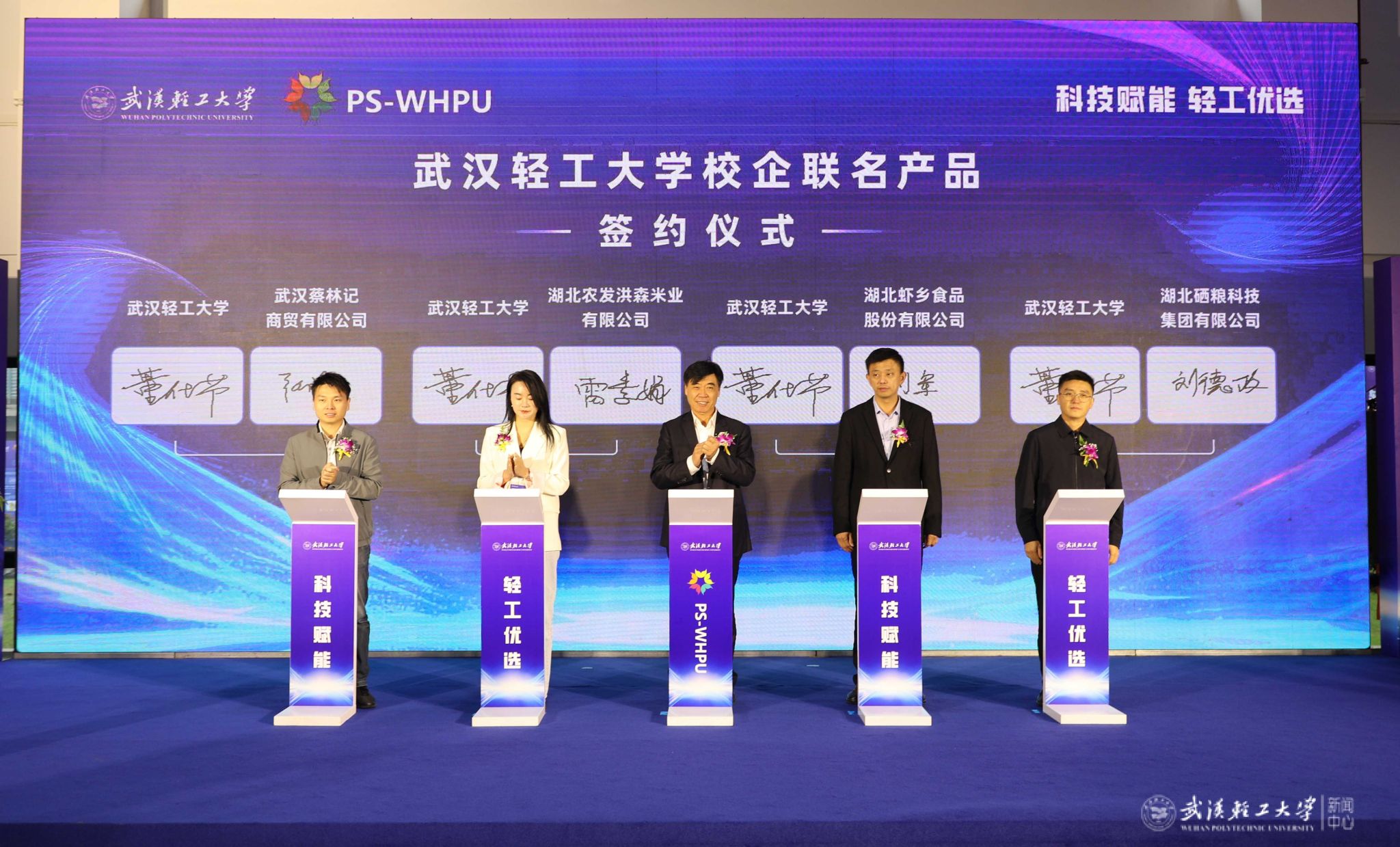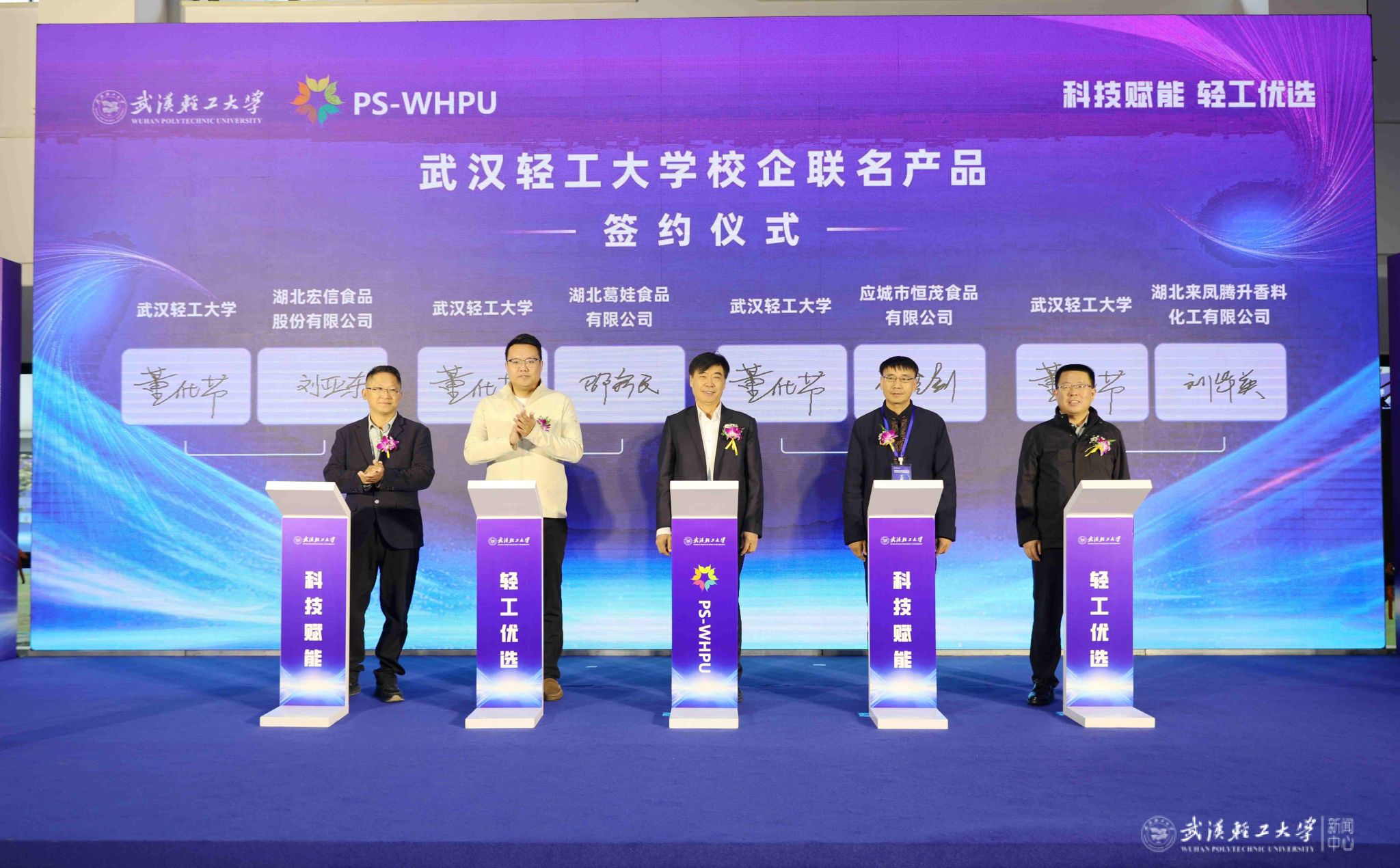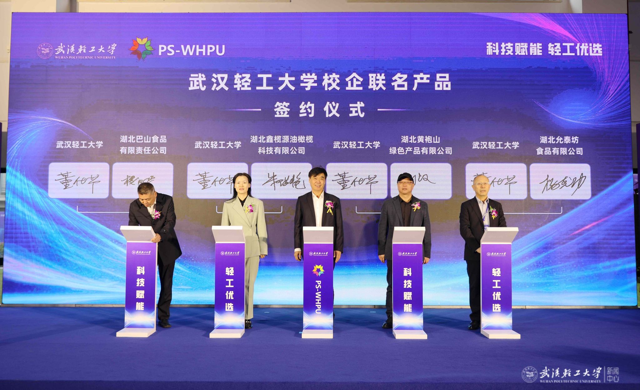 本网讯 10月20日上午,武汉轻工大学校企联名产品签约仪式暨产学研成果展在金银湖校区笃行楼举行。校党委书记严冀钢、校长董仕节等校领导,与16家联名企业、5家产学研深度合作企业领导齐聚一堂,共同开启校企联名合作新篇章,这标志着“轻工优选”品牌战略全面启动。